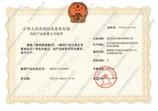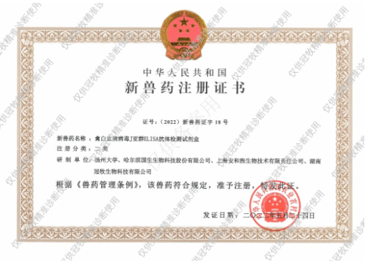 冠牧精准诊断除了有近日与中国动物疫病预防控制中心等联合研发申报的非洲猪瘟病毒荧光PCR检测试剂盒获得农业农村部兽药产品注册批准,还有禽白血病病毒J亚群ELISA抗体检测试剂盒、猪瘟病毒ELISA抗体检测试剂盒获得新兽药证书,猪繁殖与呼吸综合征病毒ELISA抗体检测试剂盒等获得兽药生产批号。