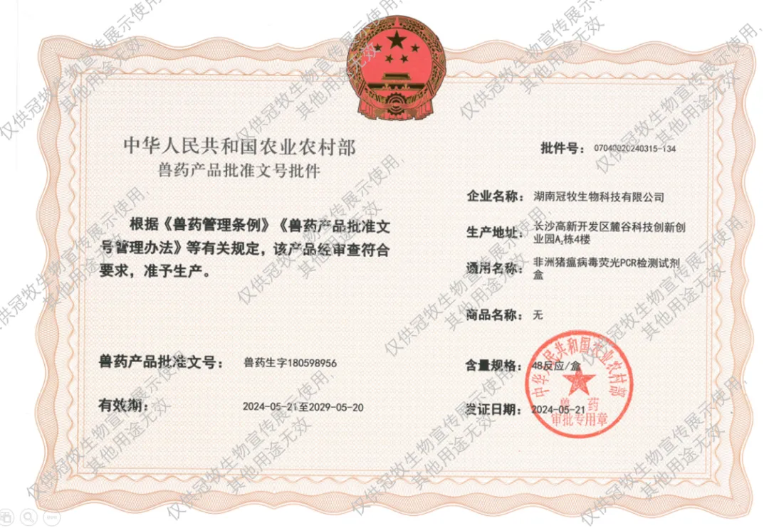 为了应对这一严峻挑战,作为(湖南)省级新型研发机构,冠牧精准诊断积极响应国家号召和养殖企业的需求,加大科研投入,致力于研发高效、准确的非洲猪瘟检测产品,以提升疾病防控能力。先后开发了非洲猪瘟病毒荧光定量PCR(一步法)试剂和非洲猪瘟病毒一步法ELISA抗体检测试剂,并于近日分别获得了由农业农村部批准的兽药生产批准文号(兽药生字180598956)和国家知识产权局颁发的发明专利证书(专利号ZL202311413033.4)。